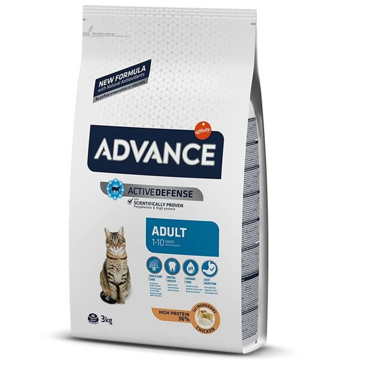 1 – 10 yaş arası kediler için protein kaynağı olarak tavuk, karbonhidrat kaynağı olarakta sindirimi kolay olan pirinç kullanılarak hazırlanmış yetişkin kedi mamasıdır. Advance, vitamin E, vitamin C, bioflavonoidler, selenyum, çinko, bakır, manganez ve taurinden oluşan antioksidan sistemi ile hücresel yaşlanmayı engeller ve sağlıklı yaşamı uzatarak yaşlanmayı geciktirir. İçerdiği immunoglobulinler hızlı bir bağışıklık yanıtı sağlayarak sindirim sistemini, özelliklede bağırsak florasını korur. Kalp sağlığını koruyan taurin katkılıdır. Optimum protein seviyesi ile güçlü kas yapısı oluşmasını sağlar ve kedinizin canlılığını ve formunu korur. Linoleik asit, omega 3 yağ asitleri, biyotin ve çinko içerdiğinden sağlıklı bir deri ve tüy yapısı sağlar. Kedinizin parlak ve pürüzsüz bir kürke sahip olmasını sağlar. İçeriğindeki mineral tuzların yanısıra şekli ve boyut olarak özel tasarlanmış olan Advance, plak oluşumunu ve diş çürüklerini engelleyerek ağız sağlığını korur. Dengeli mineral ve bileşen kombinasyonu kedinizin idrarındaki pH seviyesinin az asitli olmasını sağlayarak idrar taşlarının oluşumunu engeller.