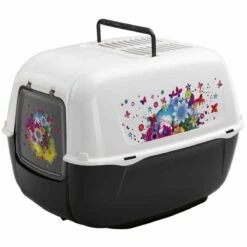 Kediler için, tuvalet ihtiyaçlarını giderirken oluşan kötü kokuların giderilmesini sağlayan, aktif karbon filtreli, kapılı, desenli, kedi tuvalet kabıdır.